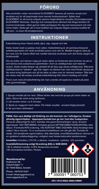 Om du kollar och känner noga på nedre delen av fordonets lack kommer du att se och känna små svarta/bruna ojämnheter i form av asfaltsprickar som fastnat i lacken. Detta medel lämpar sig utmärkt till att lösa upp dessa asfaltprickar. Eftersom asfaltsprickarna ”stänker” upp från vägen via däcken kan man med fördel spraya på lite extra kring hjulhusen och på de delar av bilen som är närmast marken. Ofta kan det räcka med att endast använda kallavfettning från bilens handtag och neråt.